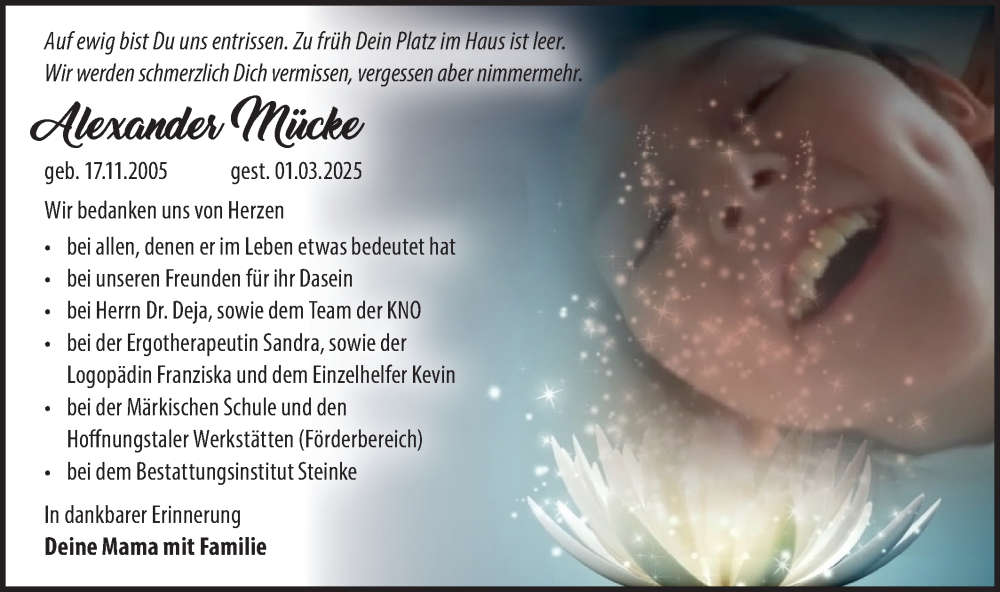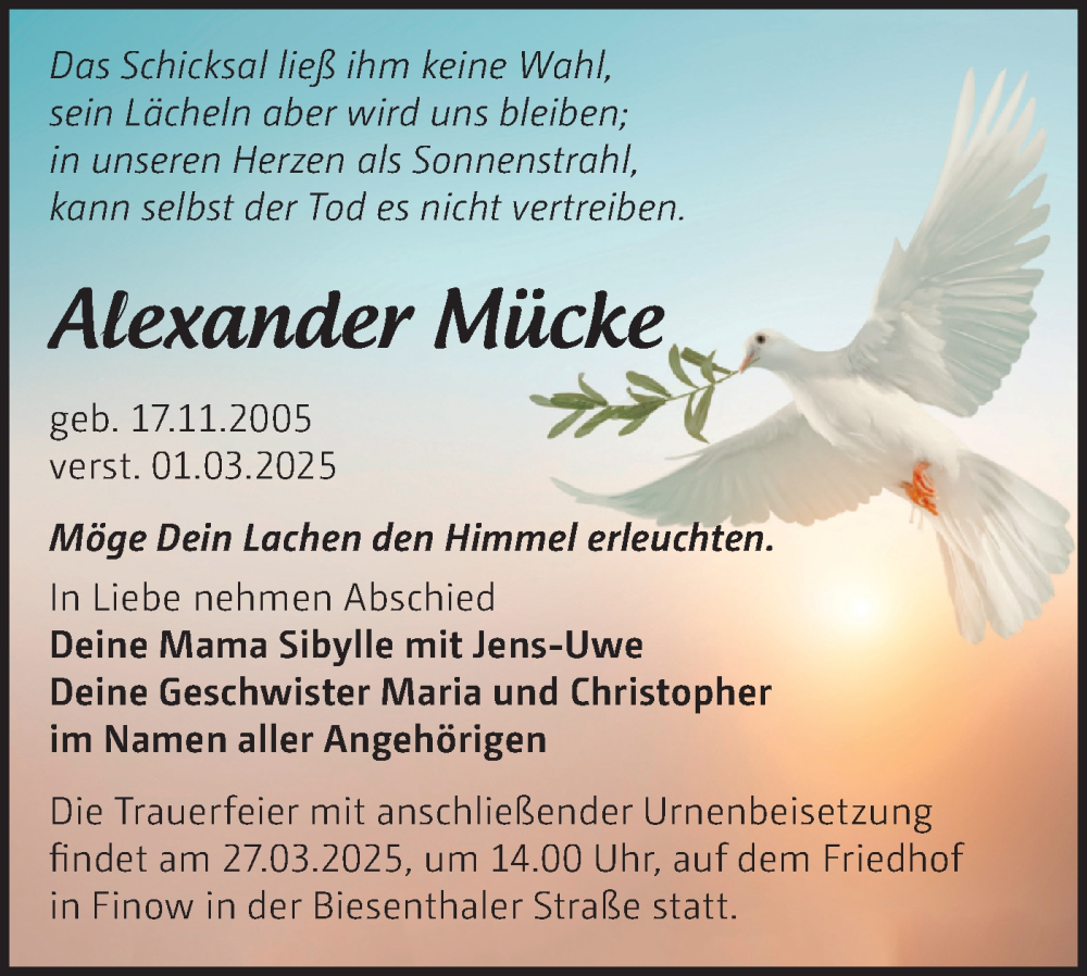 Hier finden Sie alle Traueranzeigen aus der Zeitung, die bisher für Alexander Mücke erschienen sind. Weitere Traueranzeigen, die in der Zeitung erscheinen, werden hier ebenfalls aufgelistet