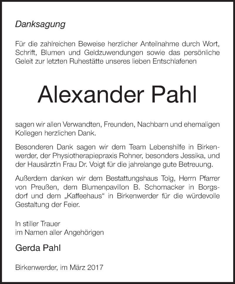Hier finden Sie alle Traueranzeigen aus der Zeitung, die bisher für Alexander Pahl erschienen sind. Weitere Traueranzeigen, die in der Zeitung erscheinen, werden hier ebenfalls aufgelistet