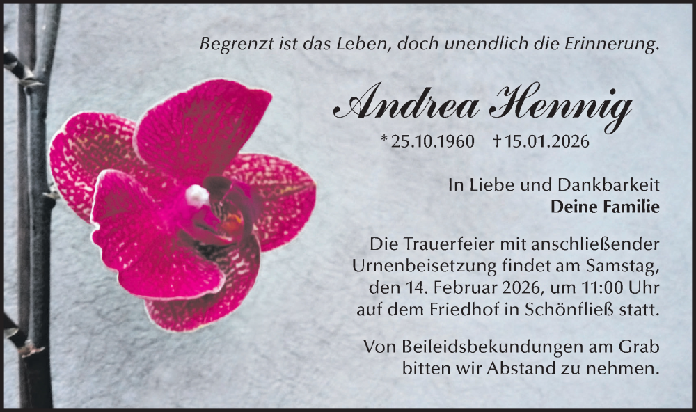 Hier finden Sie alle Traueranzeigen aus der Zeitung, die bisher für Andrea Hennig erschienen sind. Weitere Traueranzeigen, die in der Zeitung erscheinen, werden hier ebenfalls aufgelistet