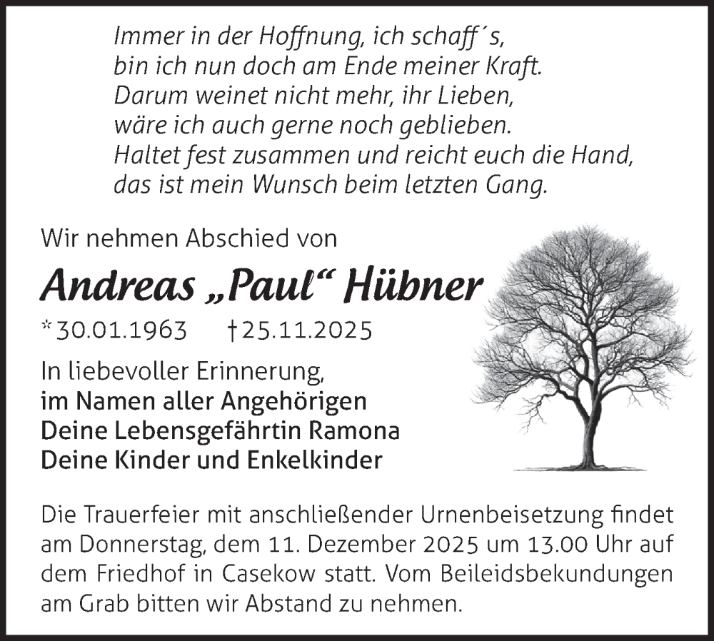 Hier finden Sie alle Traueranzeigen aus der Zeitung, die bisher für Andreas Hübner erschienen sind. Weitere Traueranzeigen, die in der Zeitung erscheinen, werden hier ebenfalls aufgelistet