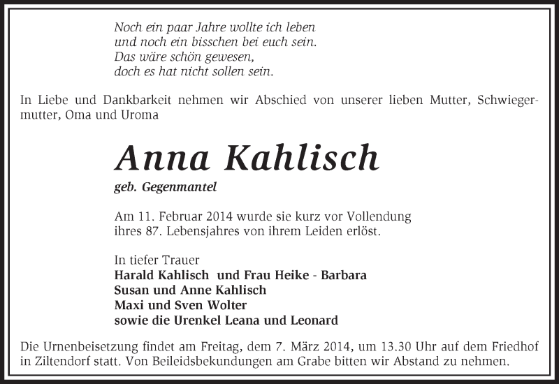 Hier finden Sie alle Traueranzeigen aus der Zeitung, die bisher für Anna Kahlisch erschienen sind. Weitere Traueranzeigen, die in der Zeitung erscheinen, werden hier ebenfalls aufgelistet