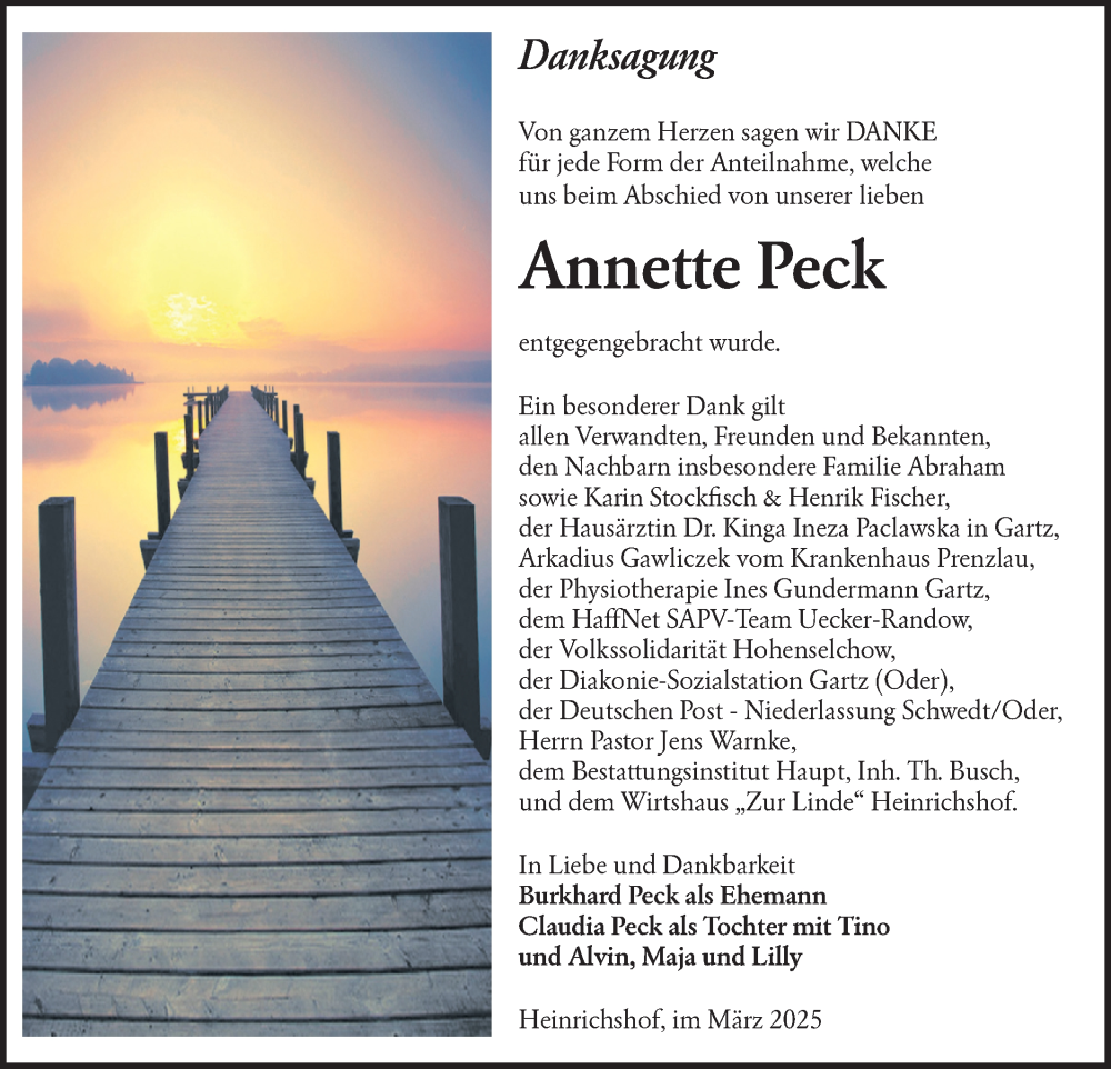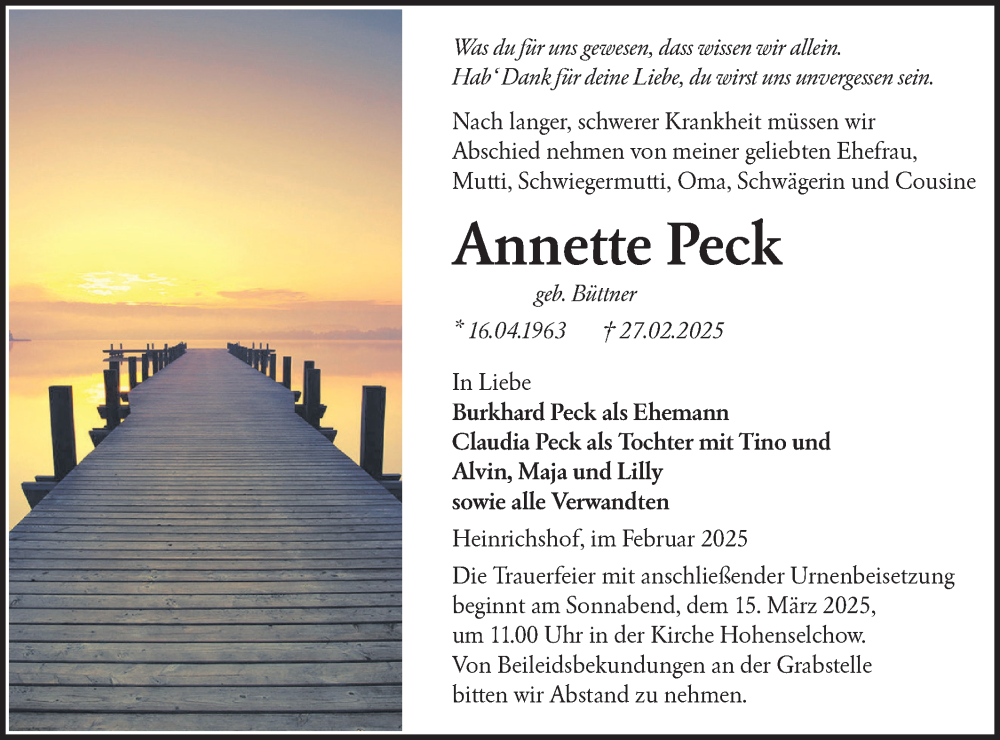 Hier finden Sie alle Traueranzeigen aus der Zeitung, die bisher für Annette Peck erschienen sind. Weitere Traueranzeigen, die in der Zeitung erscheinen, werden hier ebenfalls aufgelistet