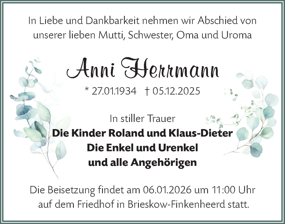 Hier finden Sie alle Traueranzeigen aus der Zeitung, die bisher für Anni Herrmann erschienen sind. Weitere Traueranzeigen, die in der Zeitung erscheinen, werden hier ebenfalls aufgelistet