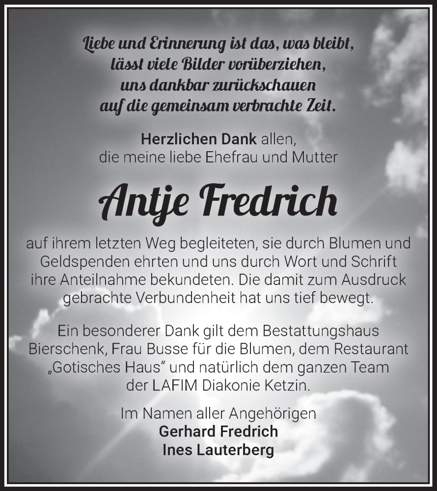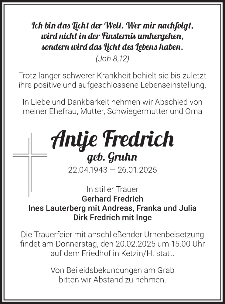 Hier finden Sie alle Traueranzeigen aus der Zeitung, die bisher für Antje Fredrich erschienen sind. Weitere Traueranzeigen, die in der Zeitung erscheinen, werden hier ebenfalls aufgelistet