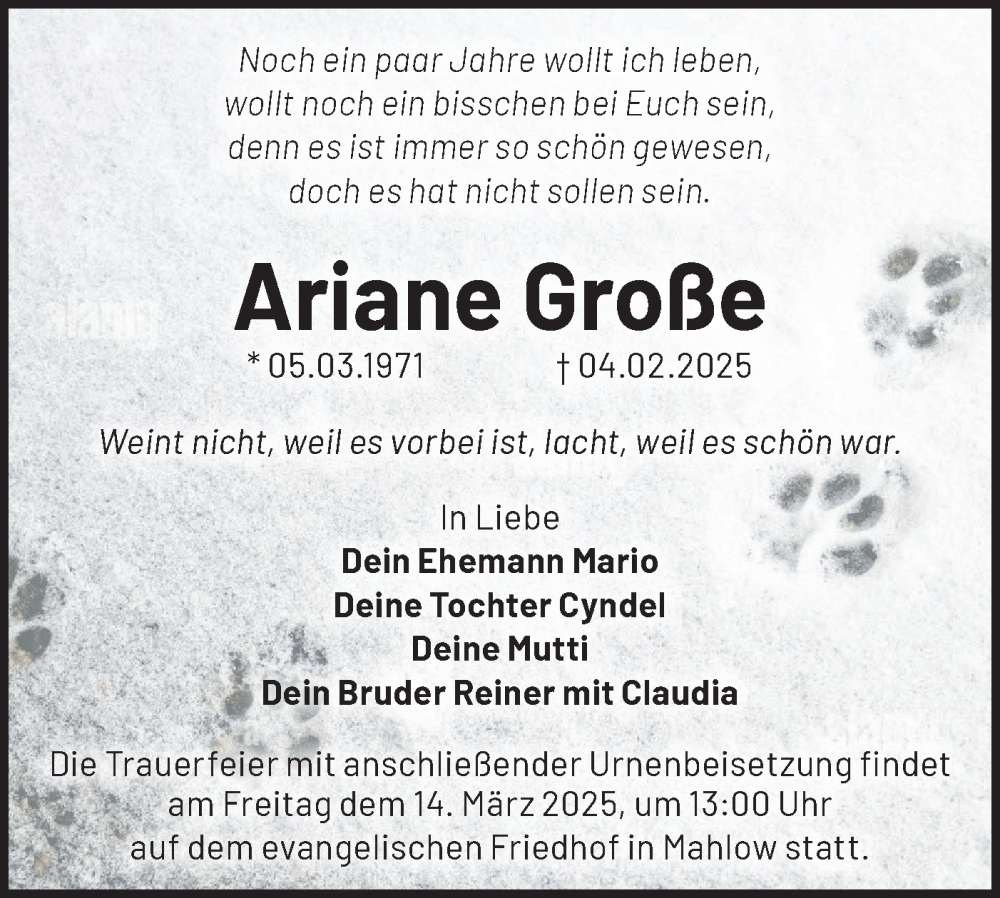 Hier finden Sie alle Traueranzeigen aus der Zeitung, die bisher für Ariane Große erschienen sind. Weitere Traueranzeigen, die in der Zeitung erscheinen, werden hier ebenfalls aufgelistet