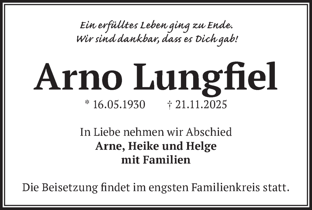 Hier finden Sie alle Traueranzeigen aus der Zeitung, die bisher für Arno Lungfiel erschienen sind. Weitere Traueranzeigen, die in der Zeitung erscheinen, werden hier ebenfalls aufgelistet