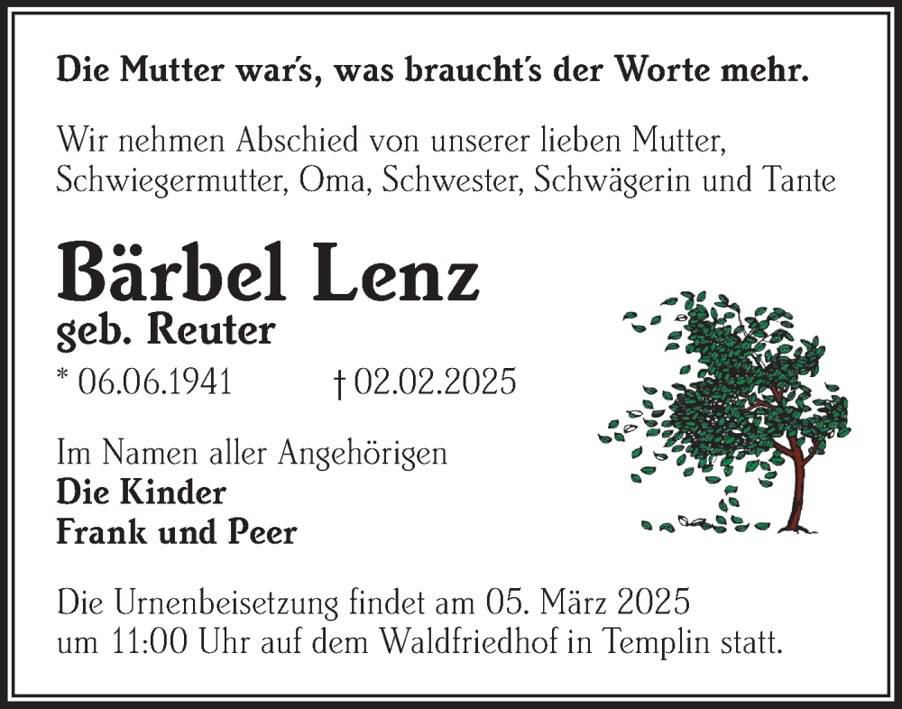 Hier finden Sie alle Traueranzeigen aus der Zeitung, die bisher für Bärbel Lenz erschienen sind. Weitere Traueranzeigen, die in der Zeitung erscheinen, werden hier ebenfalls aufgelistet