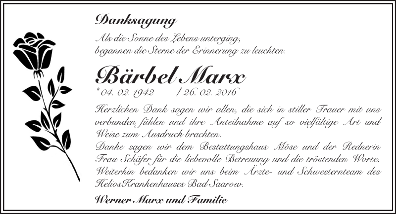 Hier finden Sie alle Traueranzeigen aus der Zeitung, die bisher für Bärbel Marx erschienen sind. Weitere Traueranzeigen, die in der Zeitung erscheinen, werden hier ebenfalls aufgelistet