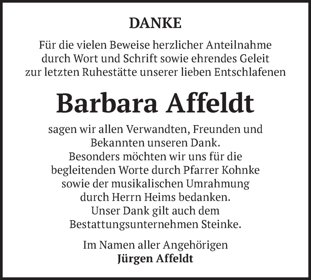 Hier finden Sie alle Traueranzeigen aus der Zeitung, die bisher für Barbara Affeldt erschienen sind. Weitere Traueranzeigen, die in der Zeitung erscheinen, werden hier ebenfalls aufgelistet