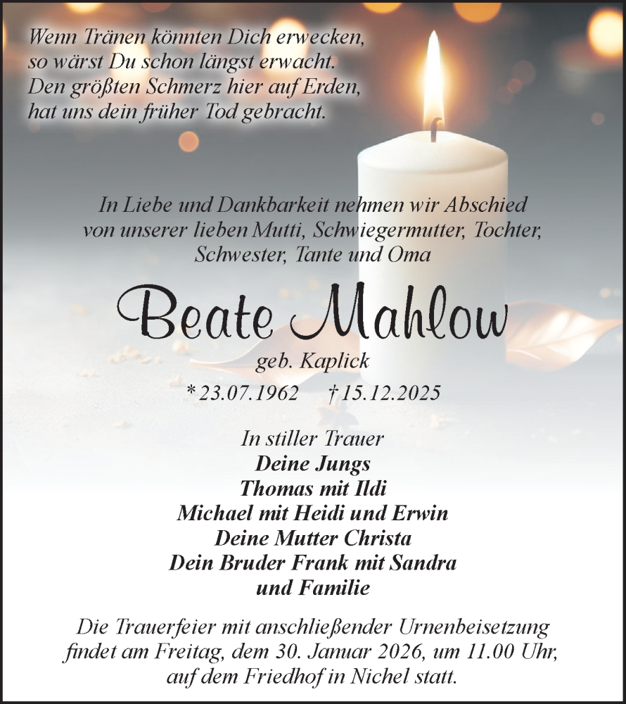 Hier finden Sie alle Traueranzeigen aus der Zeitung, die bisher für Beate Mahlow erschienen sind. Weitere Traueranzeigen, die in der Zeitung erscheinen, werden hier ebenfalls aufgelistet