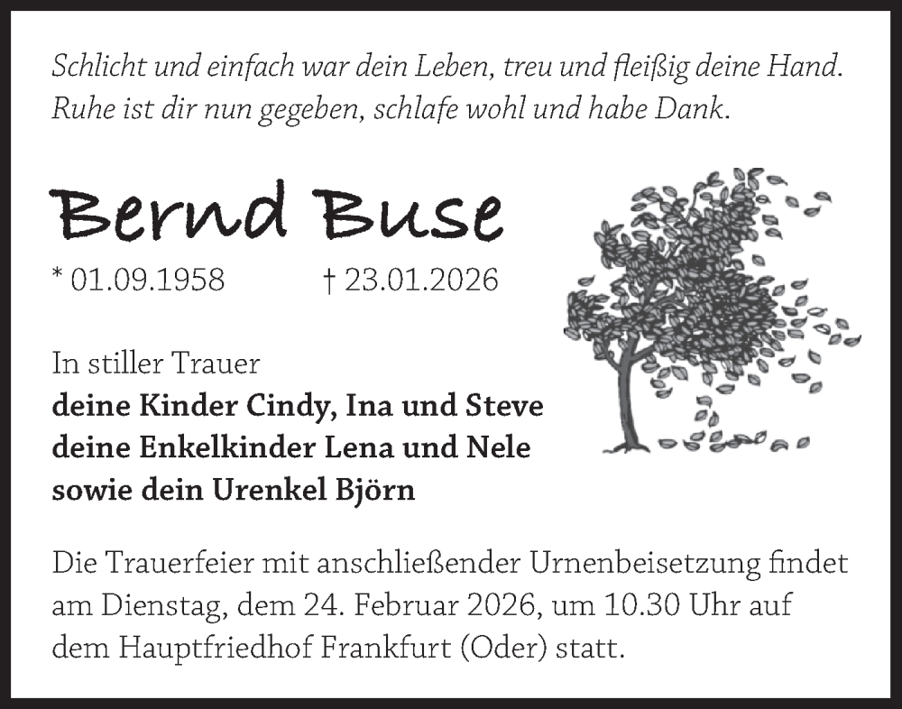 Hier finden Sie alle Traueranzeigen aus der Zeitung, die bisher für Bernd Buse erschienen sind. Weitere Traueranzeigen, die in der Zeitung erscheinen, werden hier ebenfalls aufgelistet