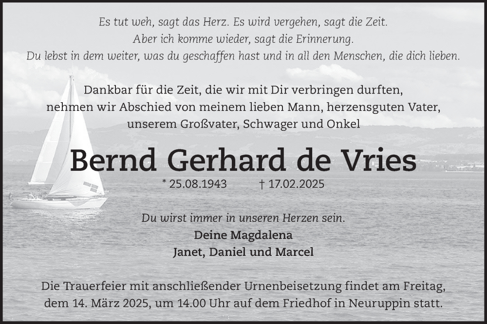 Hier finden Sie alle Traueranzeigen aus der Zeitung, die bisher für Bernd Gerhard de Vries erschienen sind. Weitere Traueranzeigen, die in der Zeitung erscheinen, werden hier ebenfalls aufgelistet