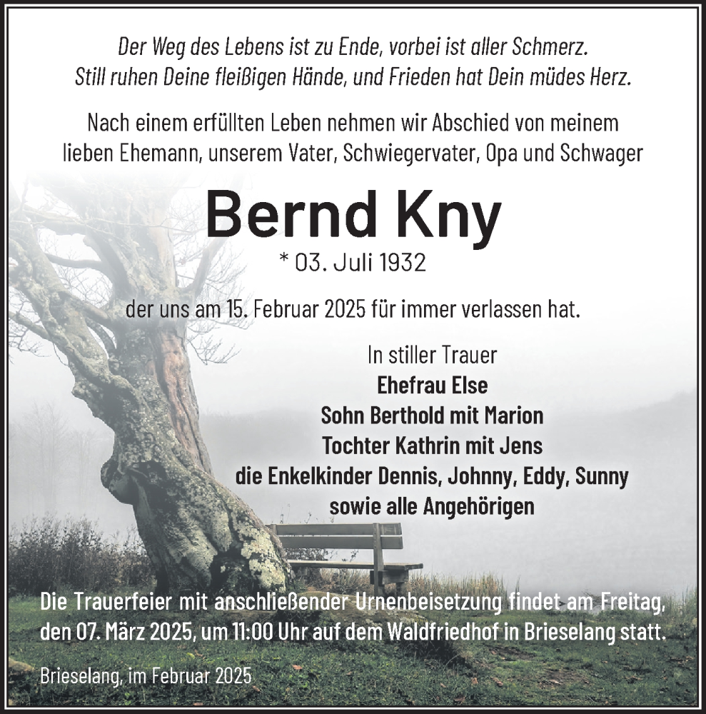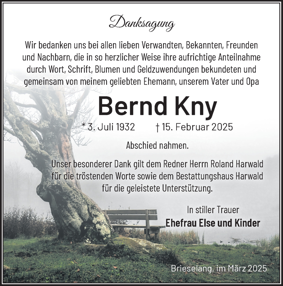 Hier finden Sie alle Traueranzeigen aus der Zeitung, die bisher für Bernd Kny erschienen sind. Weitere Traueranzeigen, die in der Zeitung erscheinen, werden hier ebenfalls aufgelistet