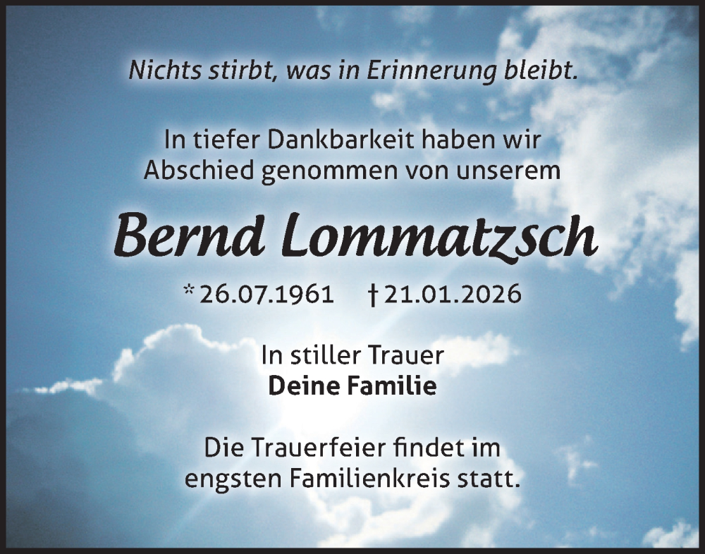 Hier finden Sie alle Traueranzeigen aus der Zeitung, die bisher für Bernd Lommatzsch erschienen sind. Weitere Traueranzeigen, die in der Zeitung erscheinen, werden hier ebenfalls aufgelistet