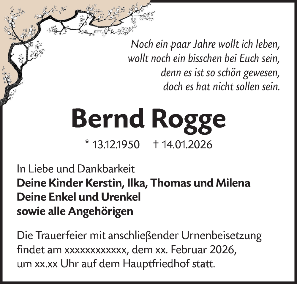 Hier finden Sie alle Traueranzeigen aus der Zeitung, die bisher für Bernd Rogge erschienen sind. Weitere Traueranzeigen, die in der Zeitung erscheinen, werden hier ebenfalls aufgelistet