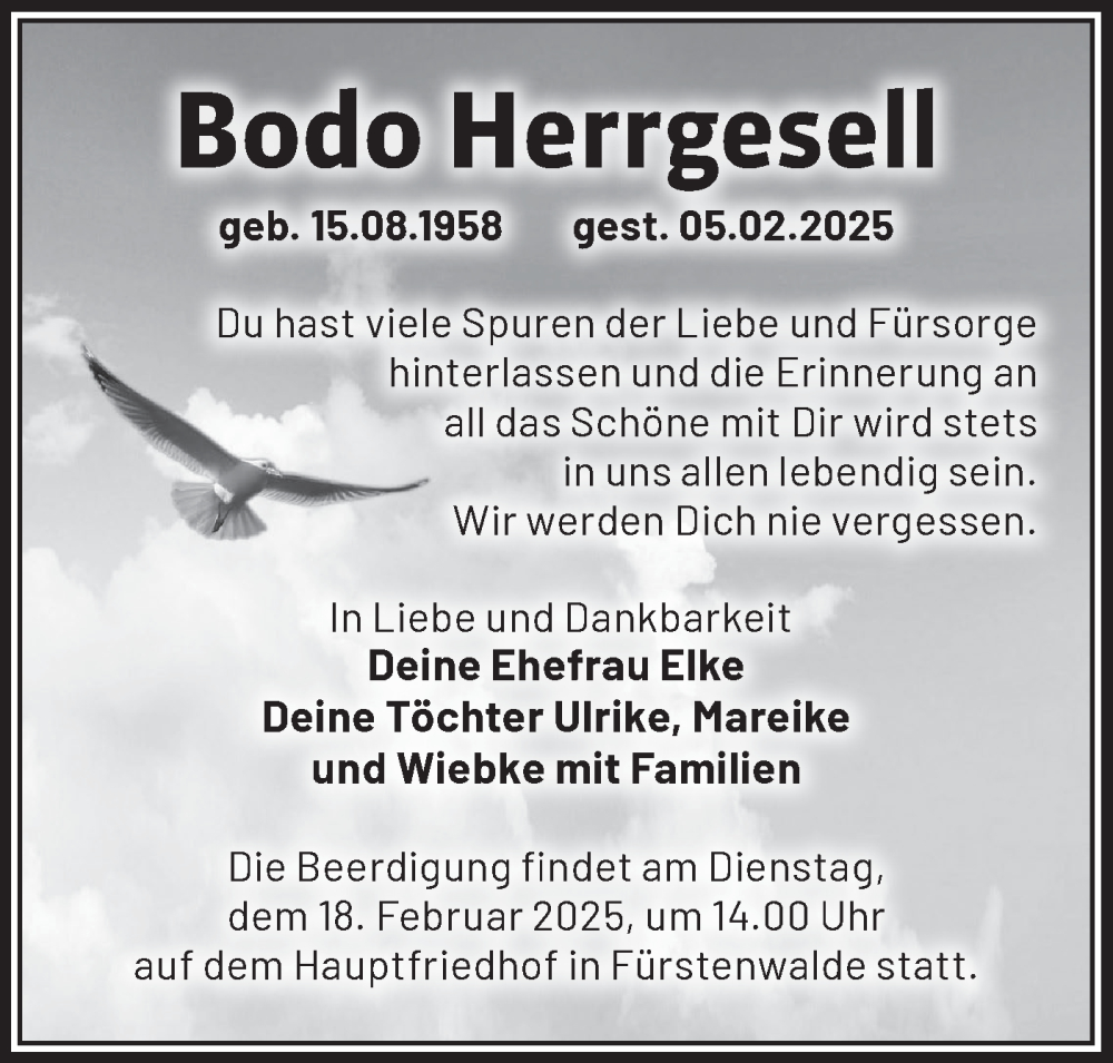 Hier finden Sie alle Traueranzeigen aus der Zeitung, die bisher für Bodo Herrgesell erschienen sind. Weitere Traueranzeigen, die in der Zeitung erscheinen, werden hier ebenfalls aufgelistet