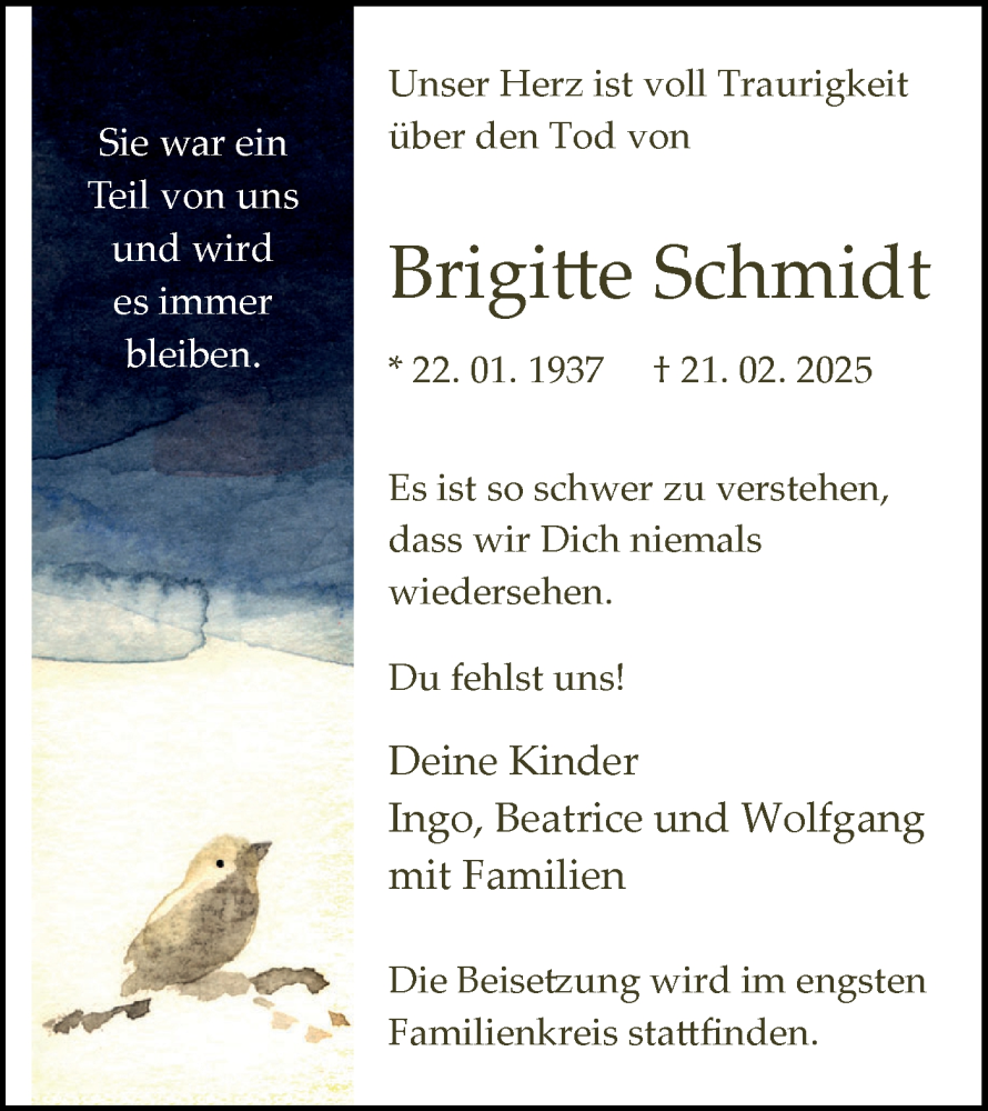 Hier finden Sie alle Traueranzeigen aus der Zeitung, die bisher für Brigitte Schmidt erschienen sind. Weitere Traueranzeigen, die in der Zeitung erscheinen, werden hier ebenfalls aufgelistet
