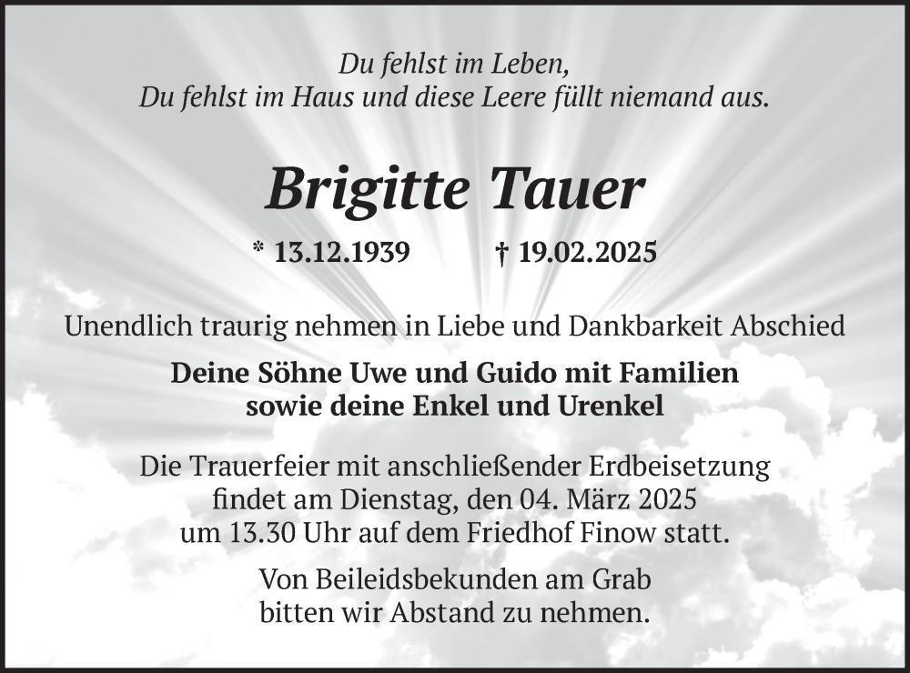 Hier finden Sie alle Traueranzeigen aus der Zeitung, die bisher für Brigitte Tauer erschienen sind. Weitere Traueranzeigen, die in der Zeitung erscheinen, werden hier ebenfalls aufgelistet