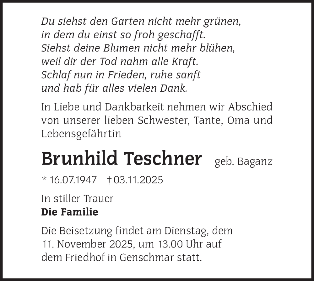 Hier finden Sie alle Traueranzeigen aus der Zeitung, die bisher für Brunhild Teschner erschienen sind. Weitere Traueranzeigen, die in der Zeitung erscheinen, werden hier ebenfalls aufgelistet