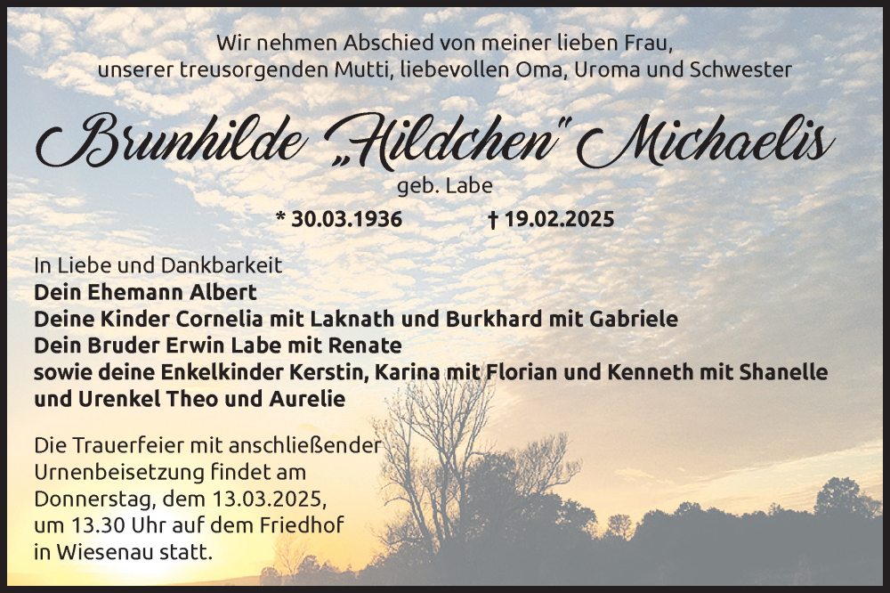 Hier finden Sie alle Traueranzeigen aus der Zeitung, die bisher für Brunhilde Michaelis erschienen sind. Weitere Traueranzeigen, die in der Zeitung erscheinen, werden hier ebenfalls aufgelistet