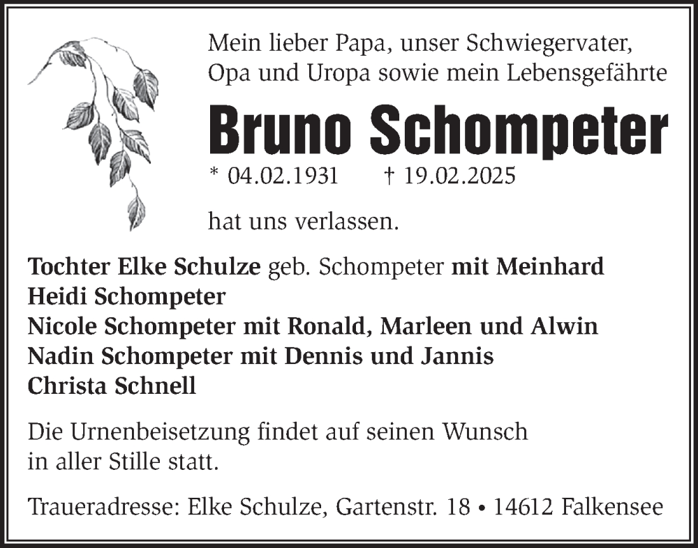 Hier finden Sie alle Traueranzeigen aus der Zeitung, die bisher für Bruno Schompeter erschienen sind. Weitere Traueranzeigen, die in der Zeitung erscheinen, werden hier ebenfalls aufgelistet