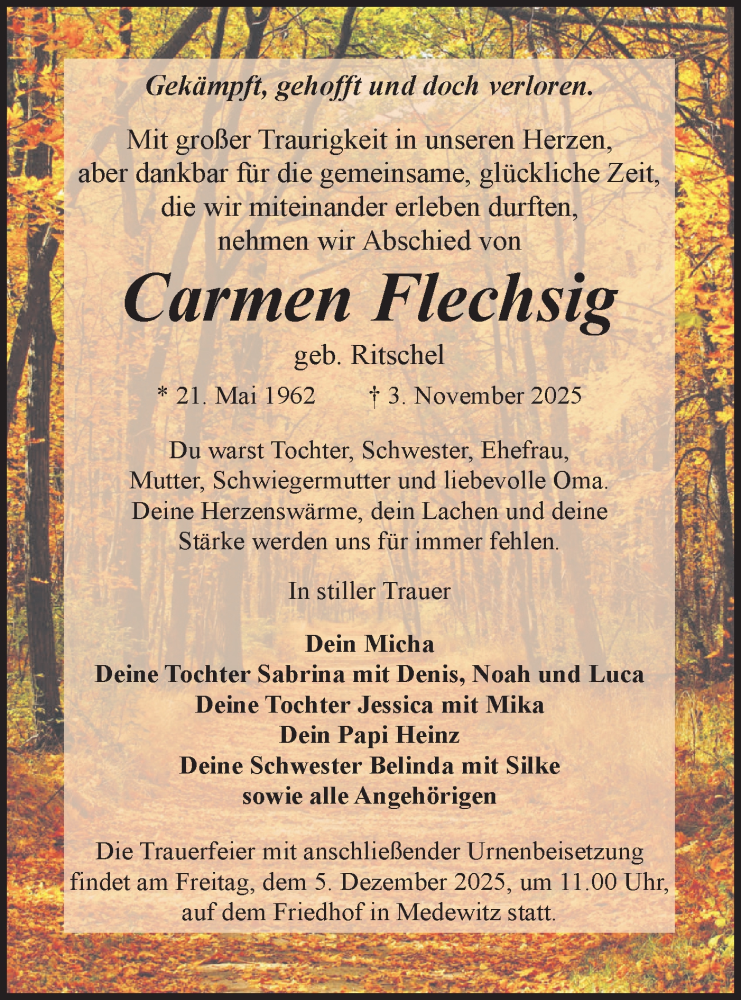 Hier finden Sie alle Traueranzeigen aus der Zeitung, die bisher für Carmen Flechsig erschienen sind. Weitere Traueranzeigen, die in der Zeitung erscheinen, werden hier ebenfalls aufgelistet
