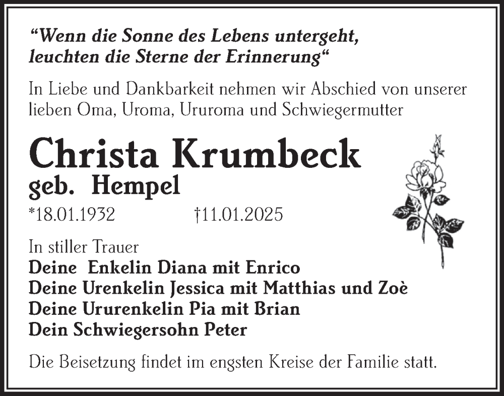 Hier finden Sie alle Traueranzeigen aus der Zeitung, die bisher für Christa Krumbeck erschienen sind. Weitere Traueranzeigen, die in der Zeitung erscheinen, werden hier ebenfalls aufgelistet