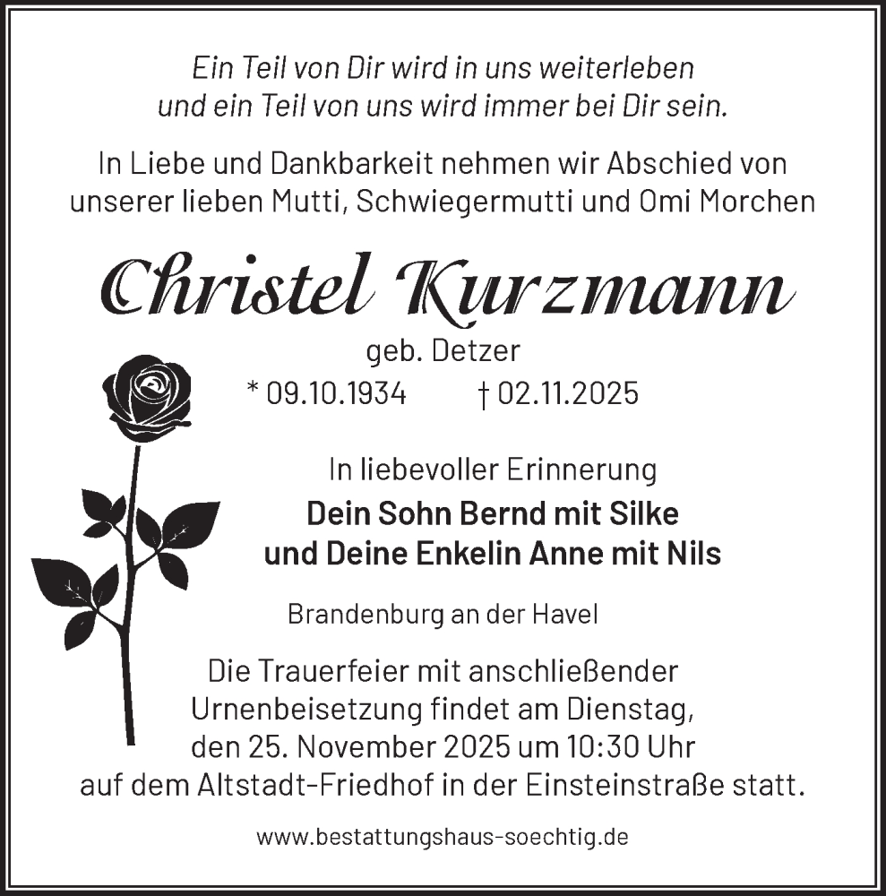 Hier finden Sie alle Traueranzeigen aus der Zeitung, die bisher für Christel Kurzmann erschienen sind. Weitere Traueranzeigen, die in der Zeitung erscheinen, werden hier ebenfalls aufgelistet