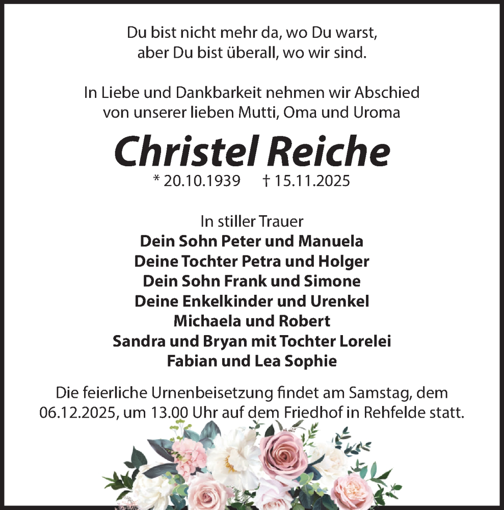 Hier finden Sie alle Traueranzeigen aus der Zeitung, die bisher für Christel Reiche erschienen sind. Weitere Traueranzeigen, die in der Zeitung erscheinen, werden hier ebenfalls aufgelistet