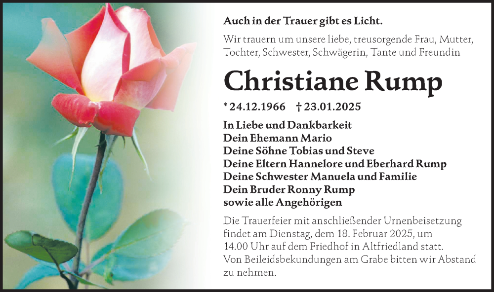 Hier finden Sie alle Traueranzeigen aus der Zeitung, die bisher für Christiane Rump erschienen sind. Weitere Traueranzeigen, die in der Zeitung erscheinen, werden hier ebenfalls aufgelistet