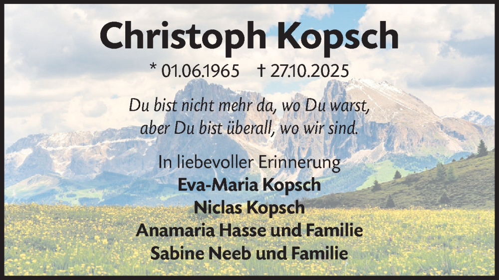 Hier finden Sie alle Traueranzeigen aus der Zeitung, die bisher für Christoph Kopsch erschienen sind. Weitere Traueranzeigen, die in der Zeitung erscheinen, werden hier ebenfalls aufgelistet