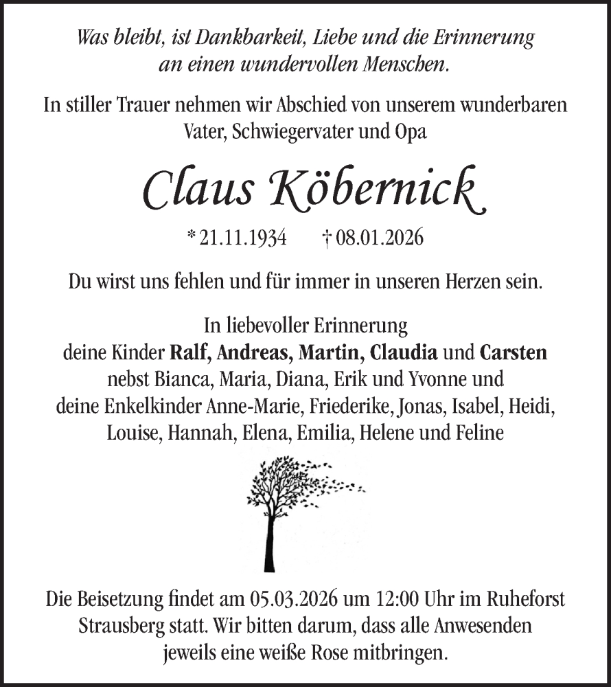 Hier finden Sie alle Traueranzeigen aus der Zeitung, die bisher für Claus Köbernick erschienen sind. Weitere Traueranzeigen, die in der Zeitung erscheinen, werden hier ebenfalls aufgelistet