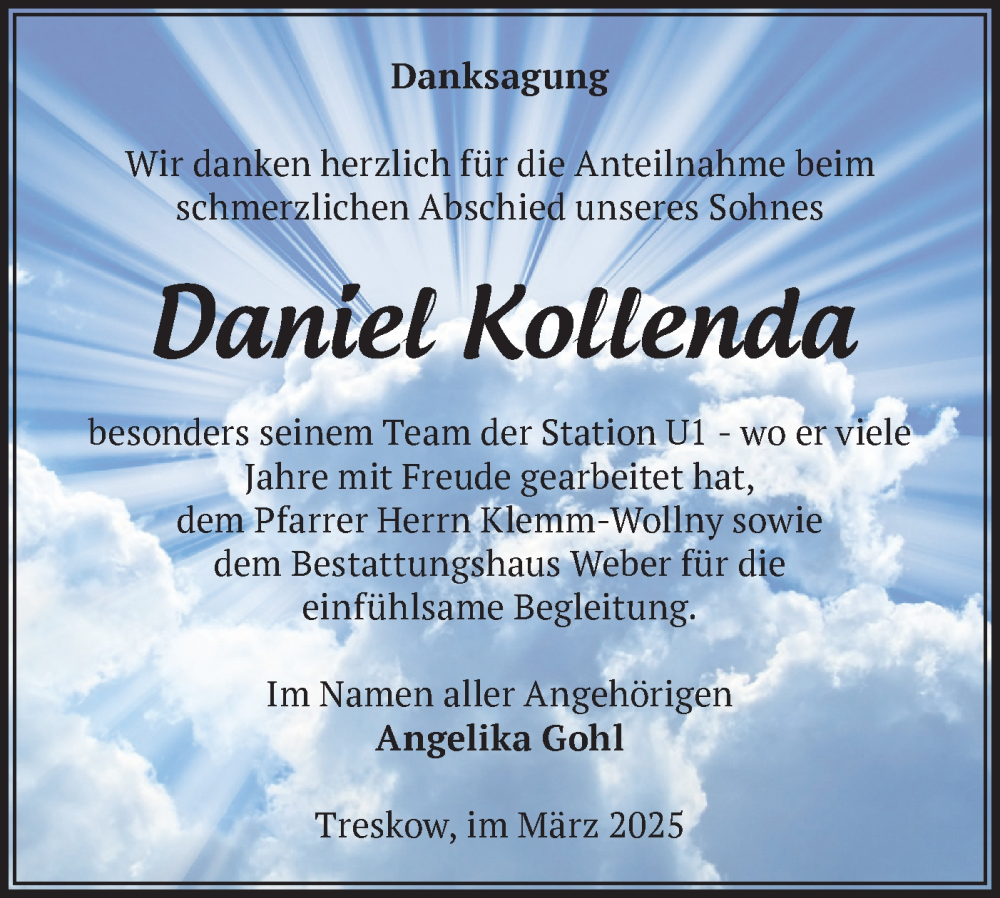 Hier finden Sie alle Traueranzeigen aus der Zeitung, die bisher für Daniel Kollenda erschienen sind. Weitere Traueranzeigen, die in der Zeitung erscheinen, werden hier ebenfalls aufgelistet