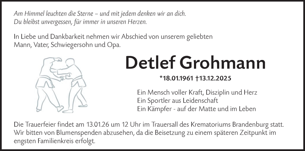 Hier finden Sie alle Traueranzeigen aus der Zeitung, die bisher für Detlef Grohmann erschienen sind. Weitere Traueranzeigen, die in der Zeitung erscheinen, werden hier ebenfalls aufgelistet