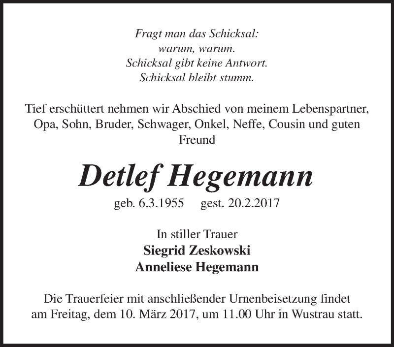 Hier finden Sie alle Traueranzeigen aus der Zeitung, die bisher für Detlef Hegemann erschienen sind. Weitere Traueranzeigen, die in der Zeitung erscheinen, werden hier ebenfalls aufgelistet