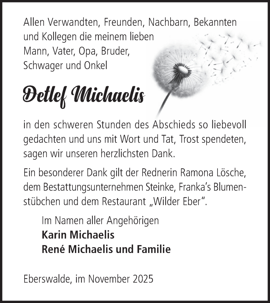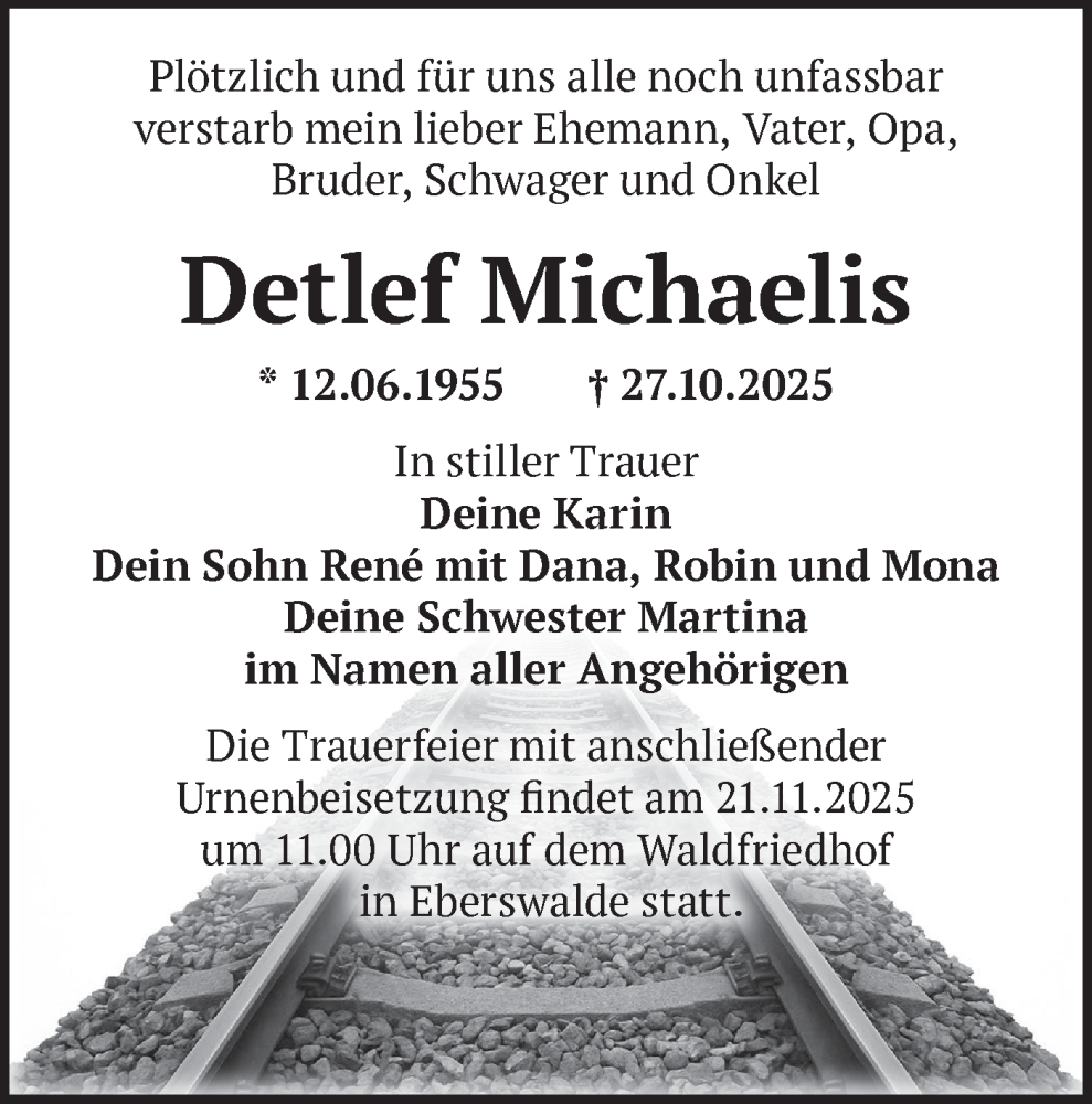 Hier finden Sie alle Traueranzeigen aus der Zeitung, die bisher für Detlef Michaelis erschienen sind. Weitere Traueranzeigen, die in der Zeitung erscheinen, werden hier ebenfalls aufgelistet