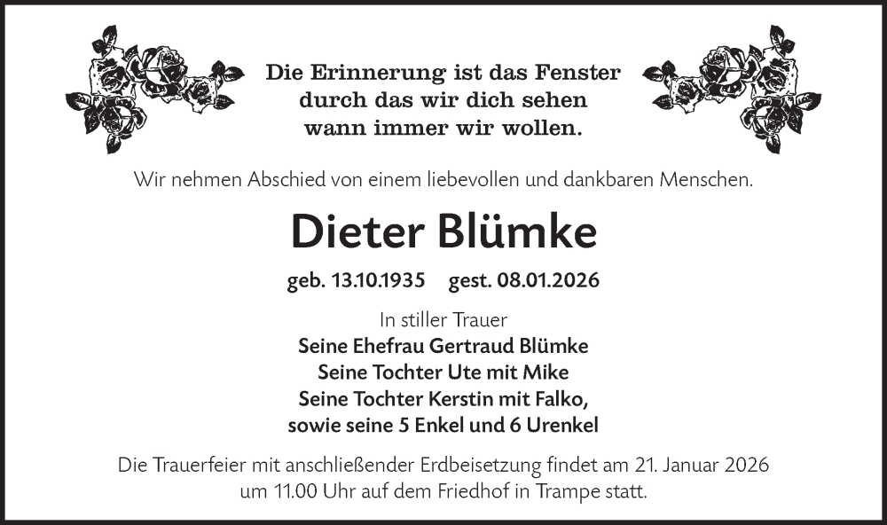 Hier finden Sie alle Traueranzeigen aus der Zeitung, die bisher für Dieter Blümke erschienen sind. Weitere Traueranzeigen, die in der Zeitung erscheinen, werden hier ebenfalls aufgelistet