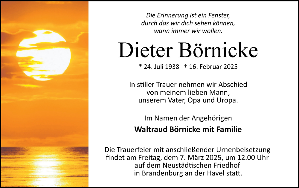 Hier finden Sie alle Traueranzeigen aus der Zeitung, die bisher für Dieter Börnicke erschienen sind. Weitere Traueranzeigen, die in der Zeitung erscheinen, werden hier ebenfalls aufgelistet