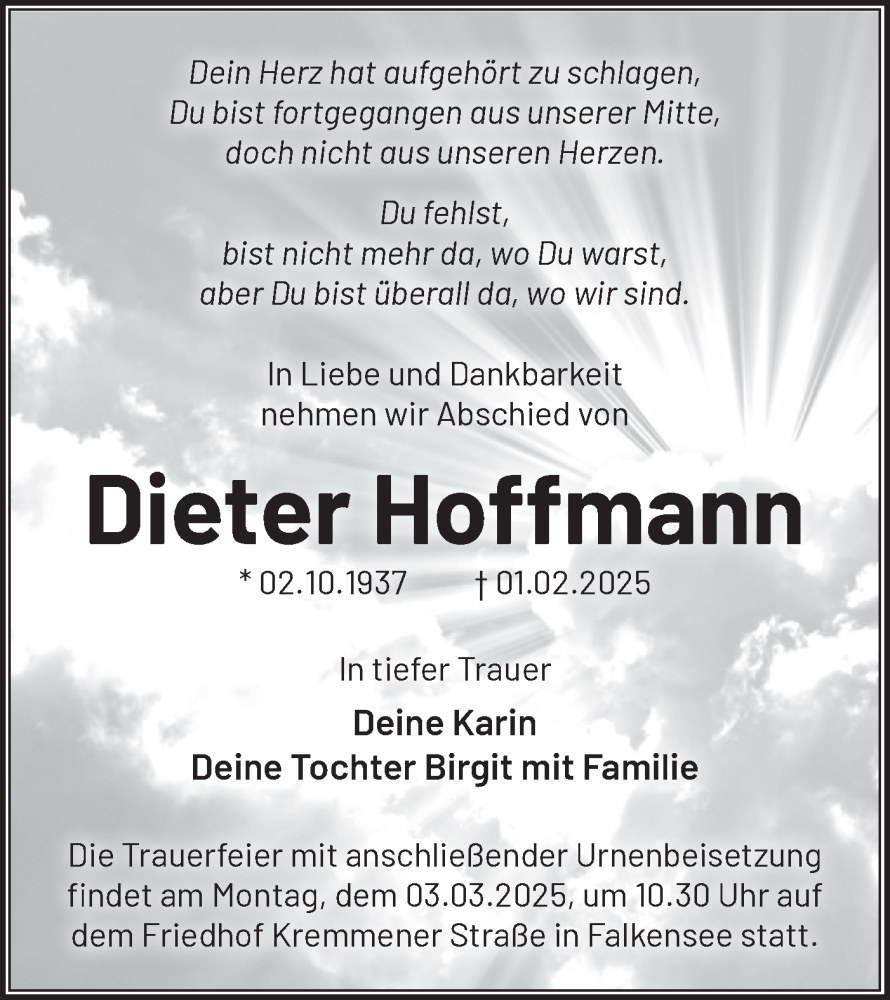 Hier finden Sie alle Traueranzeigen aus der Zeitung, die bisher für Dieter Hoffmann erschienen sind. Weitere Traueranzeigen, die in der Zeitung erscheinen, werden hier ebenfalls aufgelistet