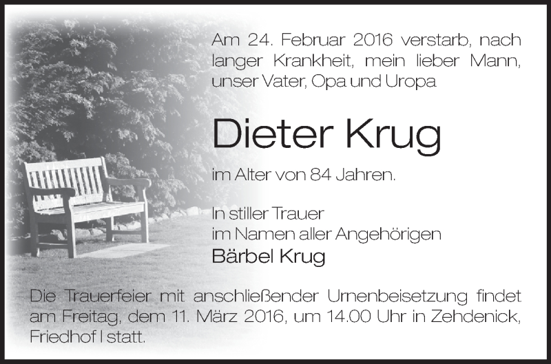 Hier finden Sie alle Traueranzeigen aus der Zeitung, die bisher für Dieter Krug erschienen sind. Weitere Traueranzeigen, die in der Zeitung erscheinen, werden hier ebenfalls aufgelistet