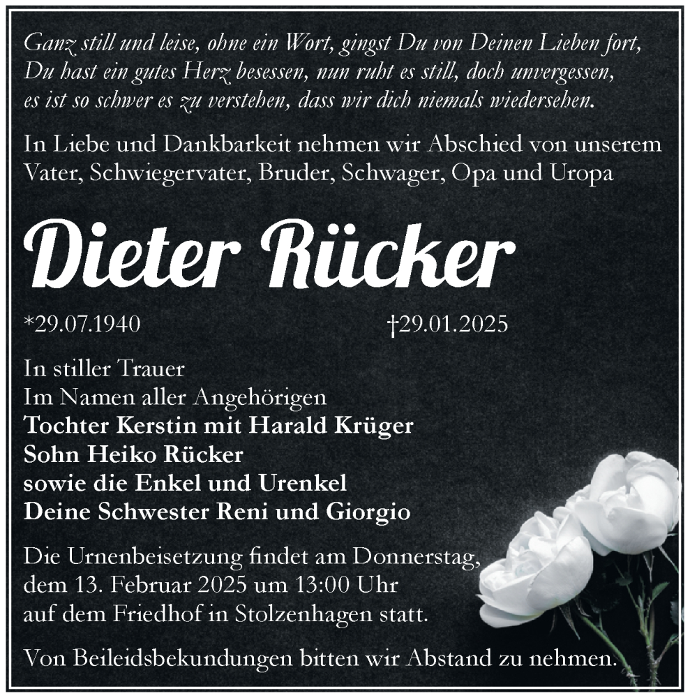 Hier finden Sie alle Traueranzeigen aus der Zeitung, die bisher für Dieter Rücker erschienen sind. Weitere Traueranzeigen, die in der Zeitung erscheinen, werden hier ebenfalls aufgelistet