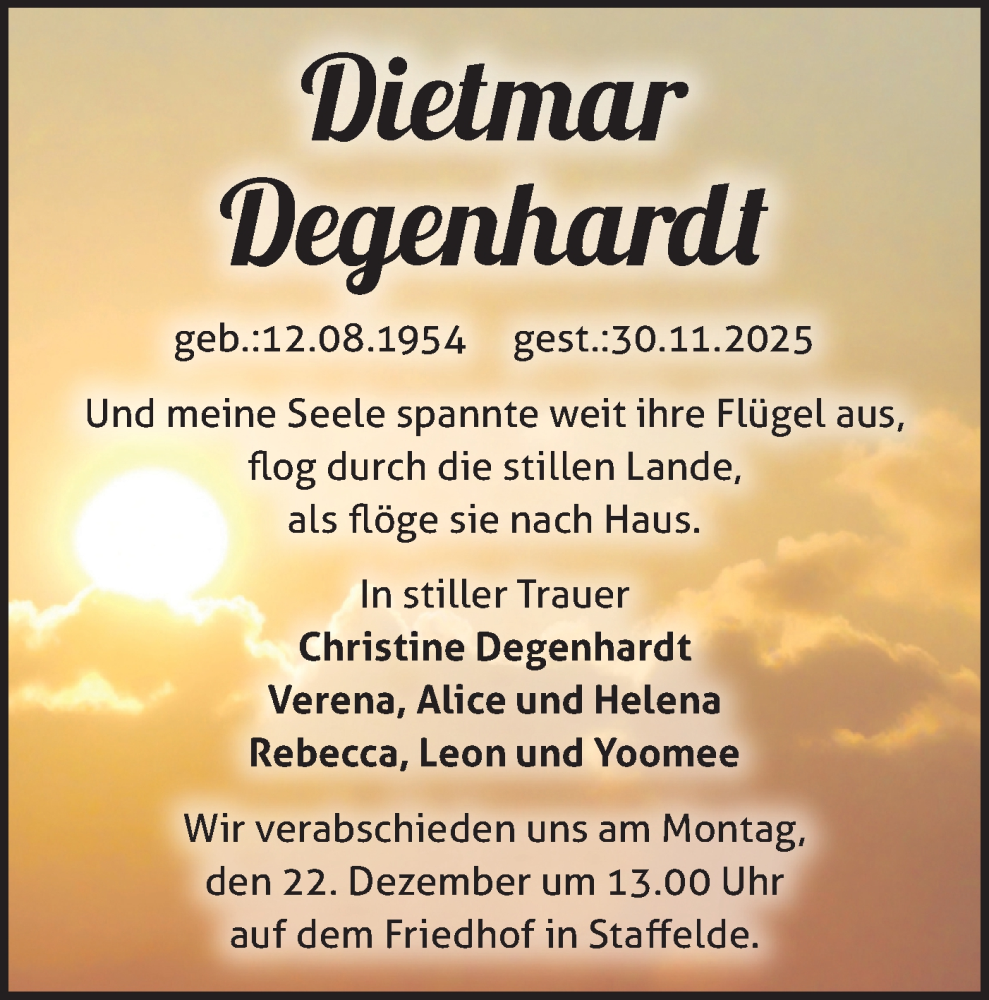 Hier finden Sie alle Traueranzeigen aus der Zeitung, die bisher für Dietmar Degenhardt erschienen sind. Weitere Traueranzeigen, die in der Zeitung erscheinen, werden hier ebenfalls aufgelistet