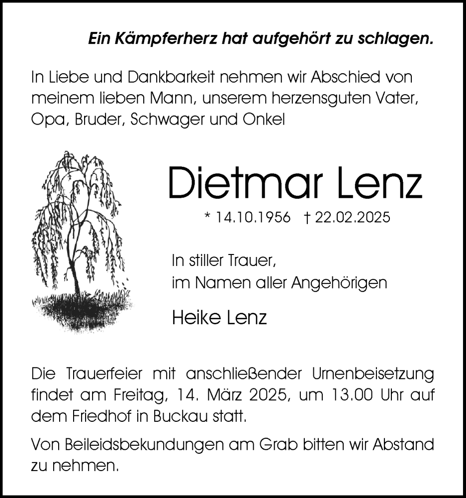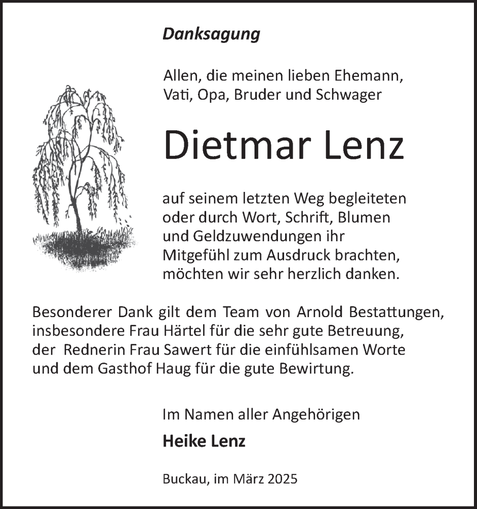 Hier finden Sie alle Traueranzeigen aus der Zeitung, die bisher für Dietmar Lenz erschienen sind. Weitere Traueranzeigen, die in der Zeitung erscheinen, werden hier ebenfalls aufgelistet