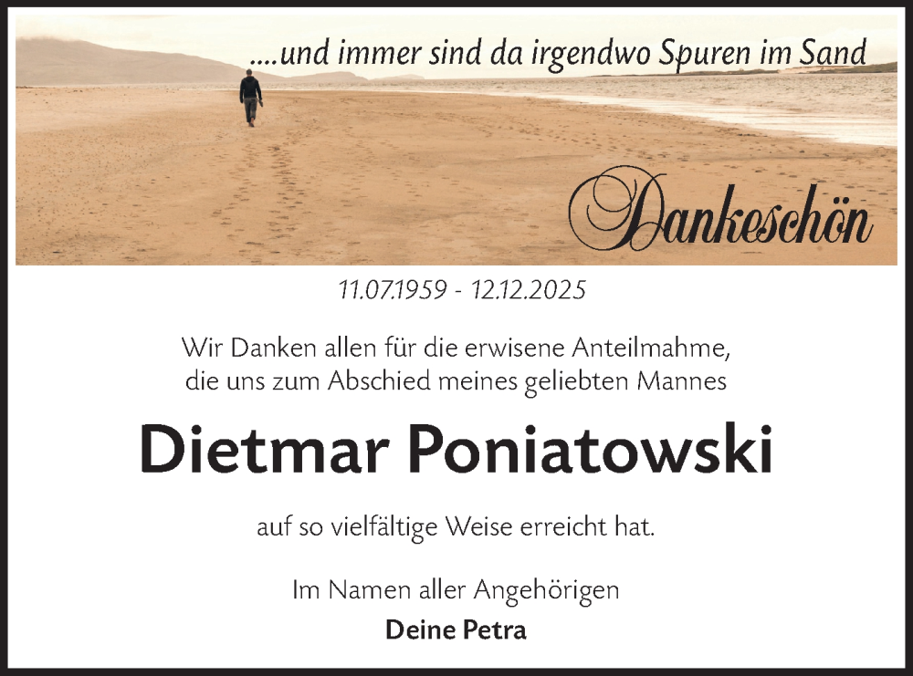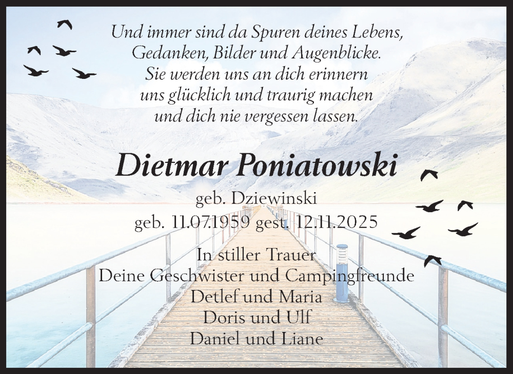 Hier finden Sie alle Traueranzeigen aus der Zeitung, die bisher für Dietmar Poniatowski erschienen sind. Weitere Traueranzeigen, die in der Zeitung erscheinen, werden hier ebenfalls aufgelistet