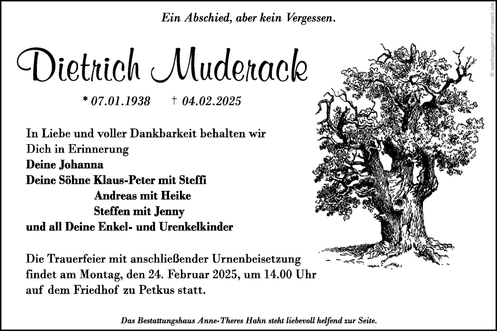 Hier finden Sie alle Traueranzeigen aus der Zeitung, die bisher für Dietrich Muderack erschienen sind. Weitere Traueranzeigen, die in der Zeitung erscheinen, werden hier ebenfalls aufgelistet