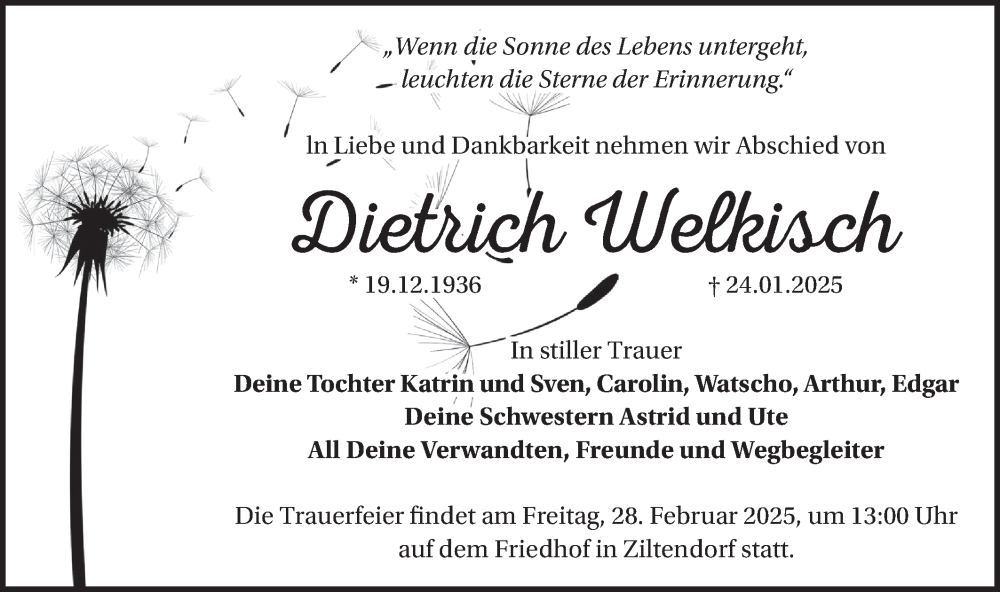 Hier finden Sie alle Traueranzeigen aus der Zeitung, die bisher für Dietrich Welkisch erschienen sind. Weitere Traueranzeigen, die in der Zeitung erscheinen, werden hier ebenfalls aufgelistet