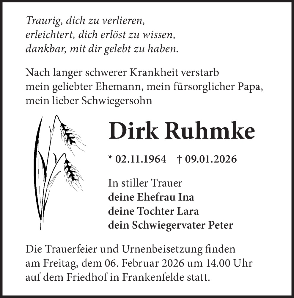 Hier finden Sie alle Traueranzeigen aus der Zeitung, die bisher für Dirk Ruhmke erschienen sind. Weitere Traueranzeigen, die in der Zeitung erscheinen, werden hier ebenfalls aufgelistet