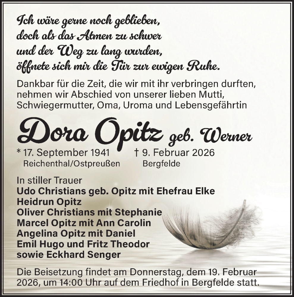 Hier finden Sie alle Traueranzeigen aus der Zeitung, die bisher für Dora Opitz erschienen sind. Weitere Traueranzeigen, die in der Zeitung erscheinen, werden hier ebenfalls aufgelistet