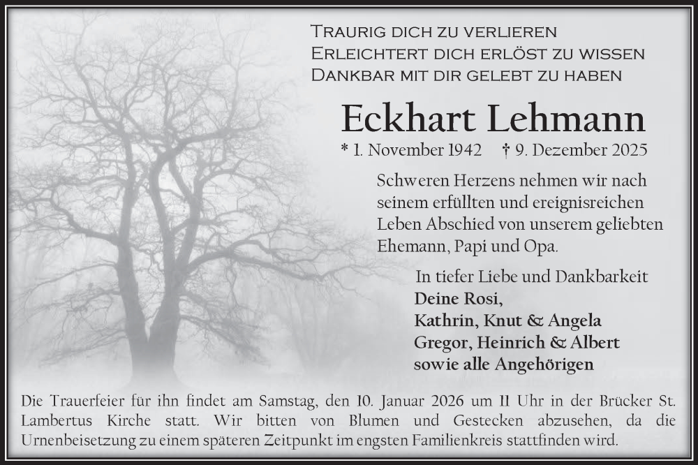 Hier finden Sie alle Traueranzeigen aus der Zeitung, die bisher für Eckhart Lehmann erschienen sind. Weitere Traueranzeigen, die in der Zeitung erscheinen, werden hier ebenfalls aufgelistet