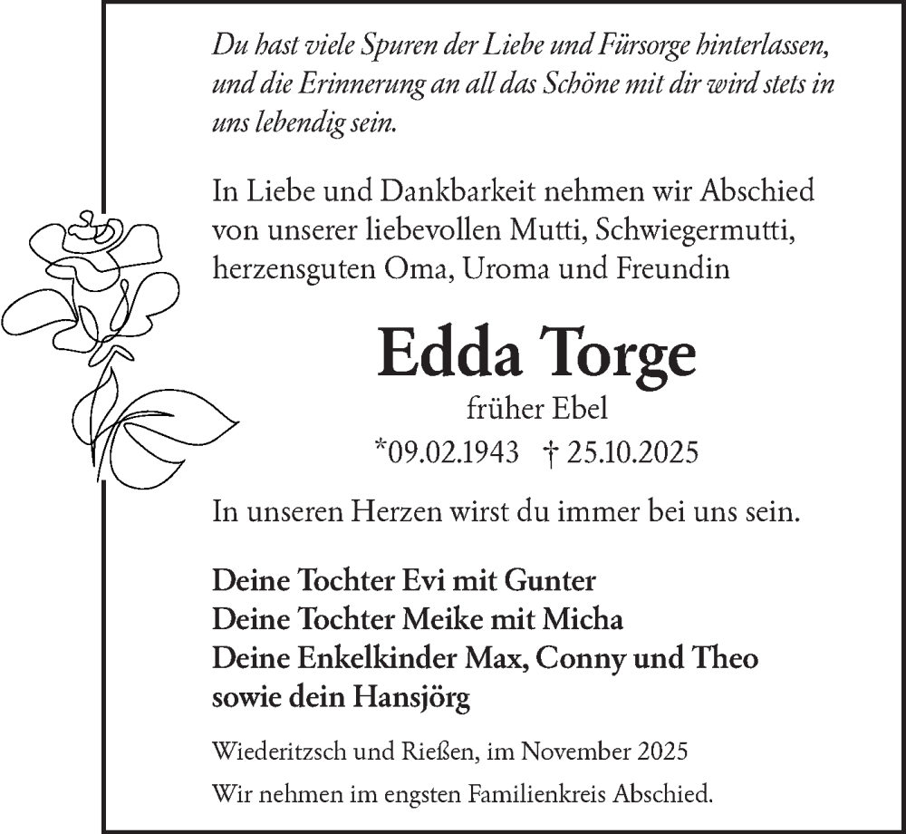 Hier finden Sie alle Traueranzeigen aus der Zeitung, die bisher für Edda Torge erschienen sind. Weitere Traueranzeigen, die in der Zeitung erscheinen, werden hier ebenfalls aufgelistet